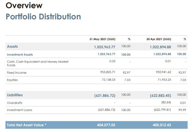 Nothing much to comment for this month, except portfolio continues to inch up slowly, which is the steady state I envision for a supposedly 'stable and safe' leveraged bond portfolio with a small allocation into blue chip equities.